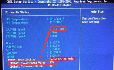 3、我们进行手动调节,将cpufan1 targetspeed value调节为255,然后按f10保存,之后重启,重新进入bios中查看风扇转速,此时风扇转速变为1048RPM,风扇转速就变小了,如图: