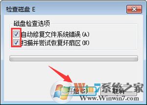 2、在弹出的“检查磁盘”对话框中同时选中“自动修复文件系统错误”和“扫描并尝试恢复坏扇区”两项,点击“开始”执行修复操作。