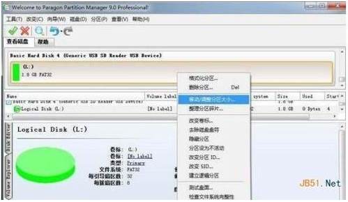3、鼠标右键选中TF卡,选择"移动/ 调整分区大小。