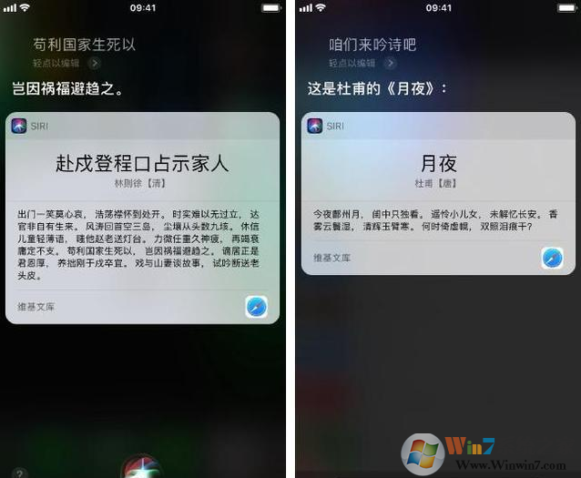Siri 可以联网检索百科(在大陆是百度百科),回答一些很神奇的问题。比如你可以跟 Siri 对诗,如果你突然想起一首诗,并想不起上下文卡得很痛苦,那么你可以试试问问 Siri,Siri 可以回答出诗词篇名、作者、全文。