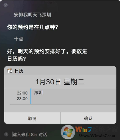 键入使用 Siri 最自然的便是添加日历日程,比如,你可以通过输入「明天十点飞深圳」添加一条带起止时间的日历项。