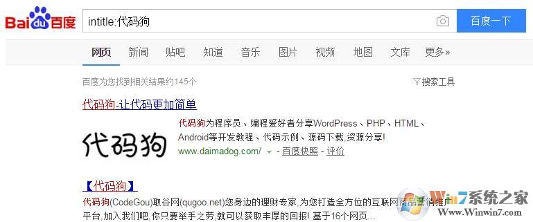 用法:intitle:代码狗 例如:intitle:代码狗 搜索引擎将返回只在标题中出现的关键词网页及数量。
