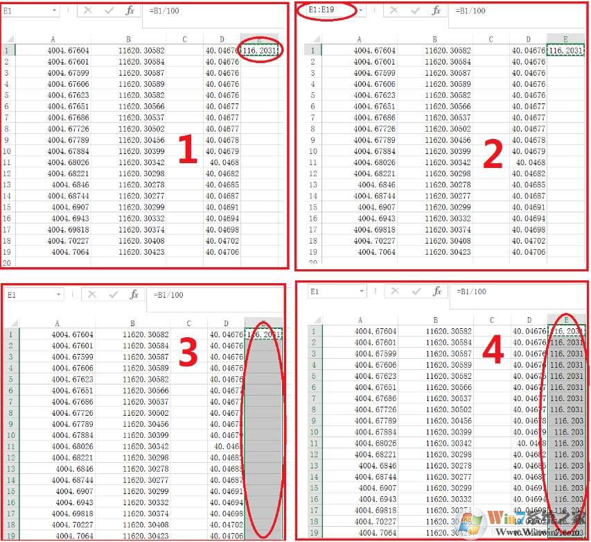 公式编辑栏输入要复制的公式(B1/100);选中要填充的格子(E1),按CTRL+C(复制第一个带公式的单元格),鼠标移动到名称框,输入需要填充的范围 (比如 E1: E19),回车,CTRL+V 粘贴即可