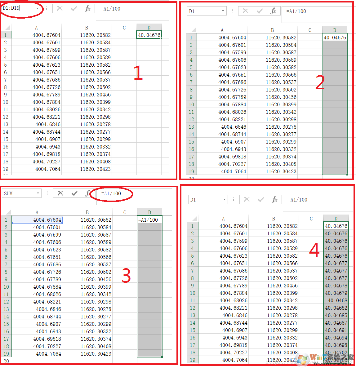 公式编辑栏输入要复制的公式(A1/100),名称框输入需要填充的范围 (比如 E1: E19) 然后回车 鼠标移动到公式编辑栏 ,同时按 CTRL+回车键输入即可