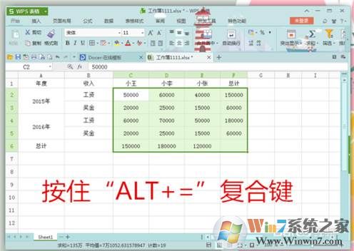 选中”数据后,按住“Alt"+"="复合键之后,就可以显示出”求和结果“了。特别的简单易操作,只要记住“Alt+=”是求和复合键就可以了。
