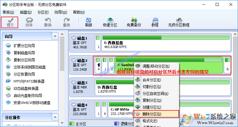 1.1、如下图:右键点击新硬盘已存在的分区选择删除分区,然后点击左上角的提交按钮即可自动删除分区。