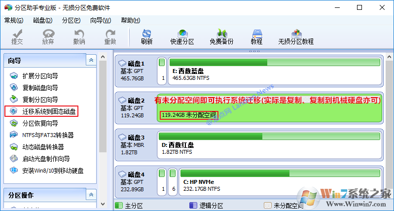 2、在处理好新硬盘有未分配空间后点击迁移系统到固态硬盘选项, 这里实际上也是可以迁移到机械硬盘的。
