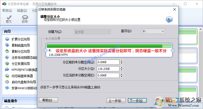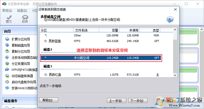 3、鼠标左键点击目标未分配空间也就是我们刚刚删除分区的空间,意思就是把系统迁移到这个未分配空间: