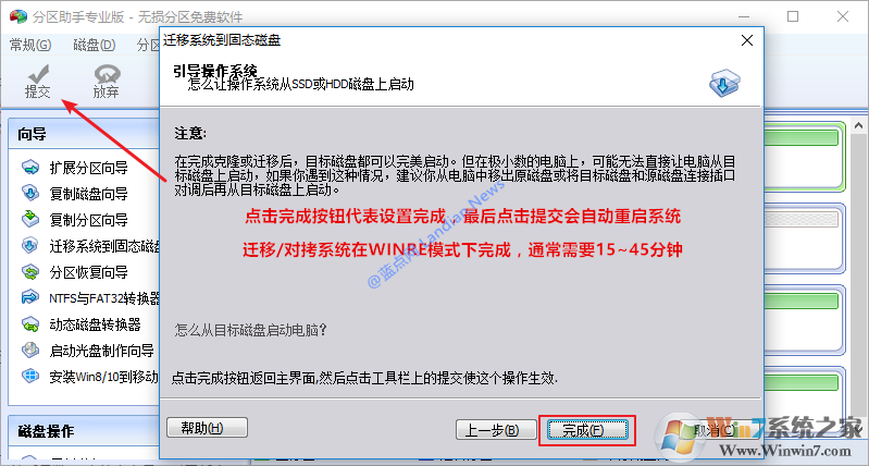 5、最后是点击完成按钮然后再点击左上角的提交按钮就会自动重启,重启后自动进入WINRE模式进行对拷。