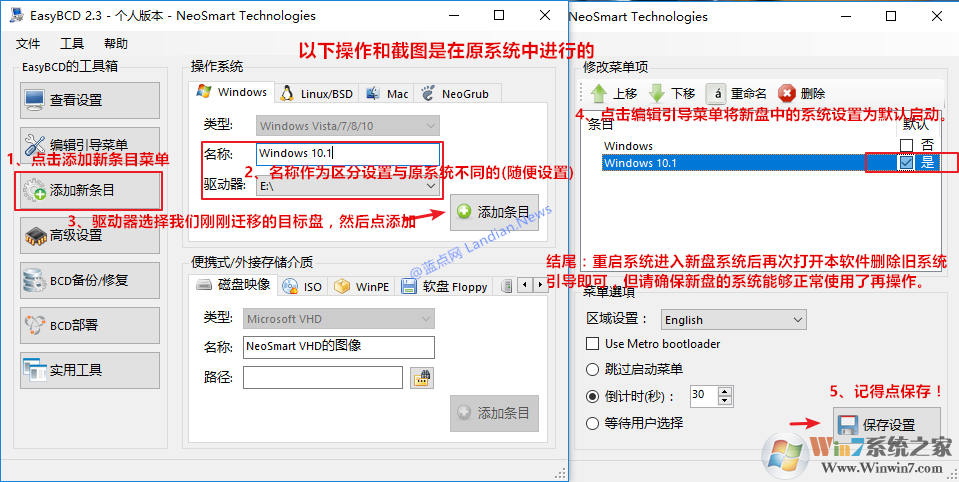 6.2、如下图:在添加新条目菜单中设置新系统的名称和所在位置,确定设置正确的情况下点击添加条目按钮。
