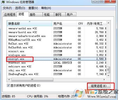 6、对了,如果别人给你发了点都点不完的,那么可以右键点击任务栏,在进程中找到 wscript.exe 结束即可。