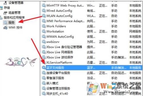 4、在服务中找到蓝牙支持服务,看看这个服务是否启动。