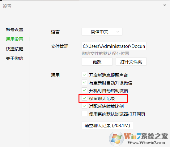 2、在跳出的窗口选择通用设置,然后将保留聊天勾选,这样聊天记录也可以保存,而聊天记录、图片、视频等文件的