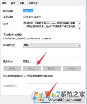 经过以上设置之后,我们的系统自动更新就在重启后被关闭了!注意!是重启后。在点击“确定”前,如果你不想让系统在重启之前生效。那么点击服务状态里的“停止”按钮,然后再点击“确定”。