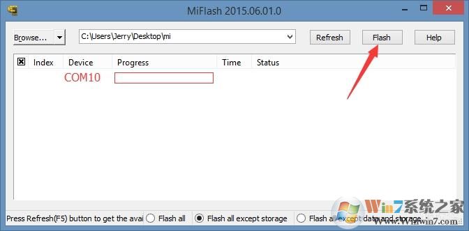 6.在电脑上启动 MiFlash,然后在工具 UI 中单击“刷新”以连接 Mi4 LTE。你将看到在名为“COM”的工具中出现行项,后面跟有数字。单击“浏览”并导航到保存已解压的 Windows 10 移动版文件的文件夹,然后单击“flash”。