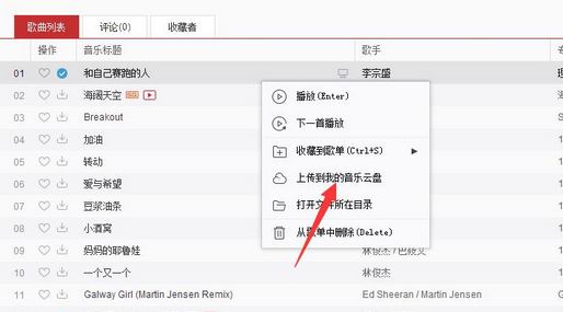 4、设置本地歌曲收藏到歌单自动上传到云盘的用户等待上传即可,忽略此步骤。没有设置的,进入相应的歌单→右键点击上传到云盘→等待转码,如图所示: