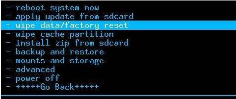 2. 通过音量键,选中倒数第二行“wipe data/factory reset”,按电源键(进入下一个界面);