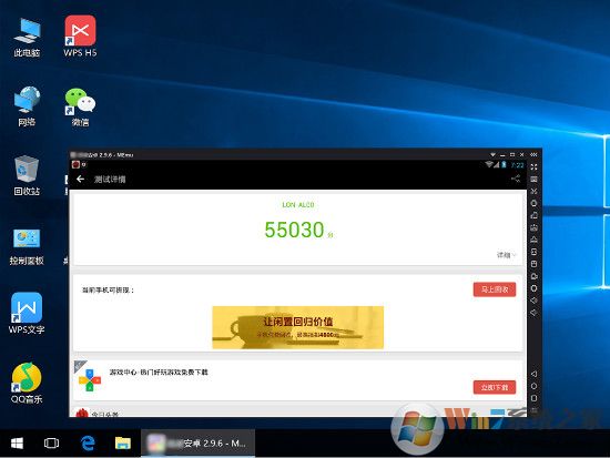 我们依然使用同一台机器,在安兔兔测试中,模拟器直接无法运行其中的一个测试项目,得分也很低。