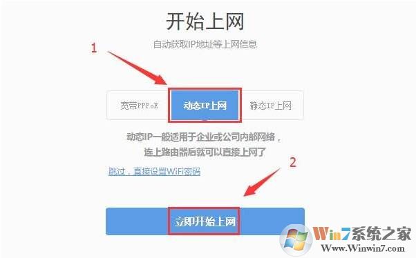 那么在设置360路由器上网时,就应该选择:动态IP上网——>点击“立即开始上网”