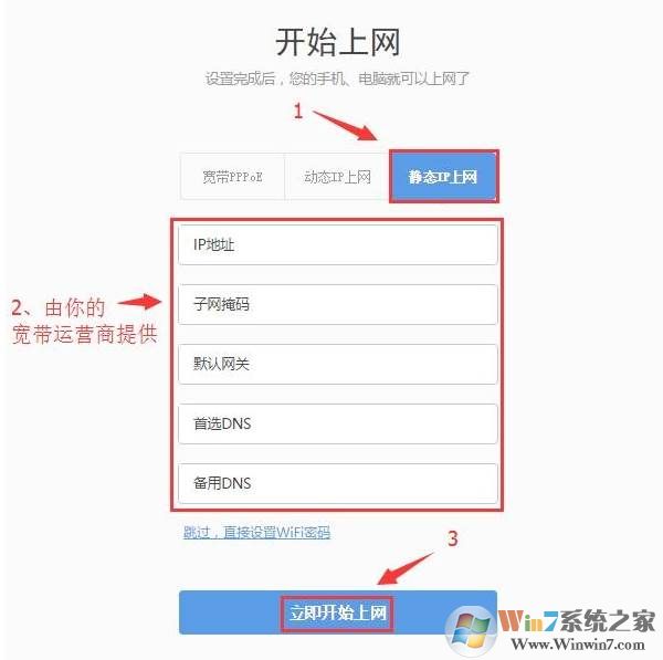 那么在设置360路由器上网时,就应该选择:静态IP——>然后填写宽带运营商提供的IP地址、子网掩码、默认网关、DNS