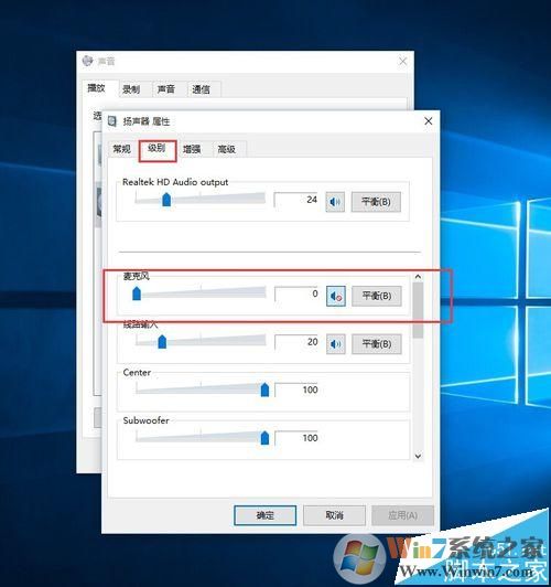 3、然后再在“扬声器”的属性里面找到“级别”,修改下面“麦克风”的数字,修改成0.