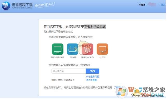 3、打开远程下载后迅雷会提醒我们绑定下载到的设备,根据自己情况选择绑定设备然后点击绑定;(绑定说明都有的哦。目前远珵下载需要迅雷自身的产品,如下载宝)