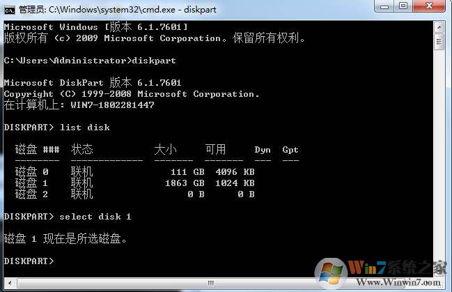 4、敲入select disk x,回车。其中x就是在上面步骤获得的磁盘编号