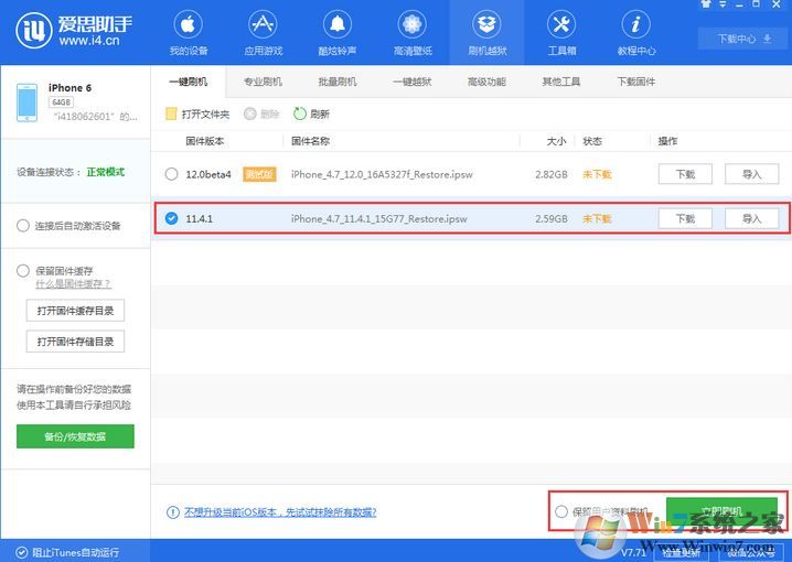 在“刷机越狱 --> 一键刷机”页面,选择需要降级的版本后,点击“立即刷机”按钮,接下来爱思助手就会自动下载固件并开始刷机,刷机完成后激活并在手机上完成初始设置。升级iOS 12beta4后降级只能降苹果开放验证的版本,爱思助手会自动匹配可降级版本。