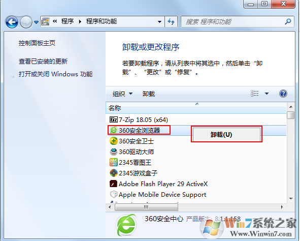 3、如果开始菜单里没有,那么到 控制面板——卸载删除程序中找到360浏览器;然后右键点击卸载。