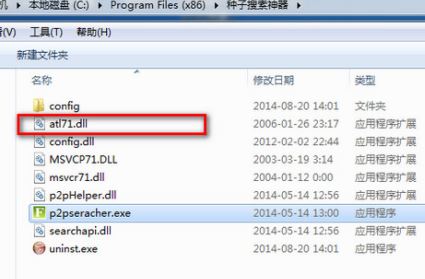 2、到P2PSearcher目录下查看有没有atl7.dll这个文件,如果没有,可以去网上下载;如果懒得下载,你的电脑上有安装迅雷,可以到Program目录中拷贝这个文件到C:windowssystem32,或是到P2PSearcher目录下,如图