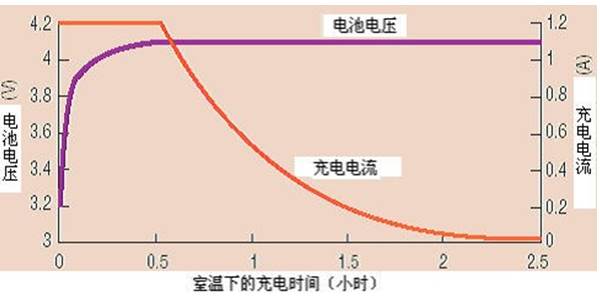 锂离子电池的充电过程分为两个阶段:恒流快充恒压电流递减阶段。恒流快充阶段,电池电压逐步升高到电池的标准电压,随后在控制芯片下转入恒压阶段,电压不再升高以确保不会过充,电流则随着电池电量的上升逐步减弱到零,而最终完成充电。由此可见,当充电指示灯转换为“充满”状态时,实际充电电路依然在对电池做小电流充电,直至电池完全充满、电流为零为止。如下图所示,典型锂离子电池充电曲线图。黄色曲线为整个电池充电周期中,电池的充电电流值的变化,以右侧的纵轴标注的电流值为参考;紫色曲线为电池(电芯)电压的变化曲线图,以左侧的纵轴标注的电压值为参考。