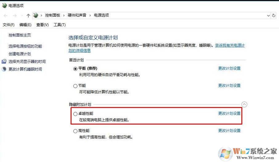 此时再打开电源计划管理选项,展开隐藏的附加计划后,选择 卓越性能 模式就可以让电脑性能最大化了,据测试性能将有10%的提升。