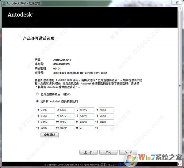 10、选择“我具有Autodesk提供的激活码”,将上面的激活码复制到信息框内,如下图所示: