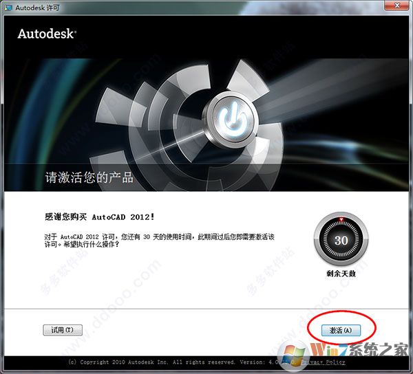 6、点击桌面上的“AutoCAD 2012 - Simplified Chinese”快捷图标启动autocad 2012,在弹出的Autodesk注册框中选择“激活”选项