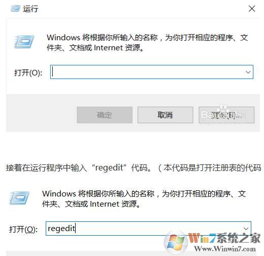 1、同时按下Win键+R键,在运行命令窗口输入regedit,回车。
