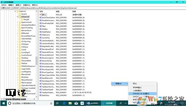 HKEY_CURRENT_USER\Software\Microsoft\Windows\CurrentVersion\Explorer\Advanced,在空白处右击,选择新建【DWORD(32位)值】