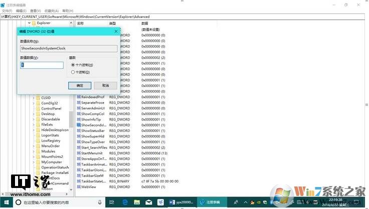 3.将新建值的名称改为ShowSecondsInSystemClock,并双击编辑数值数据,将其改为1,点击确定。