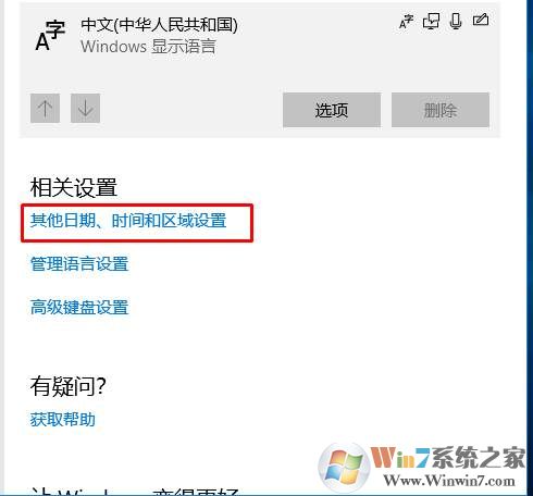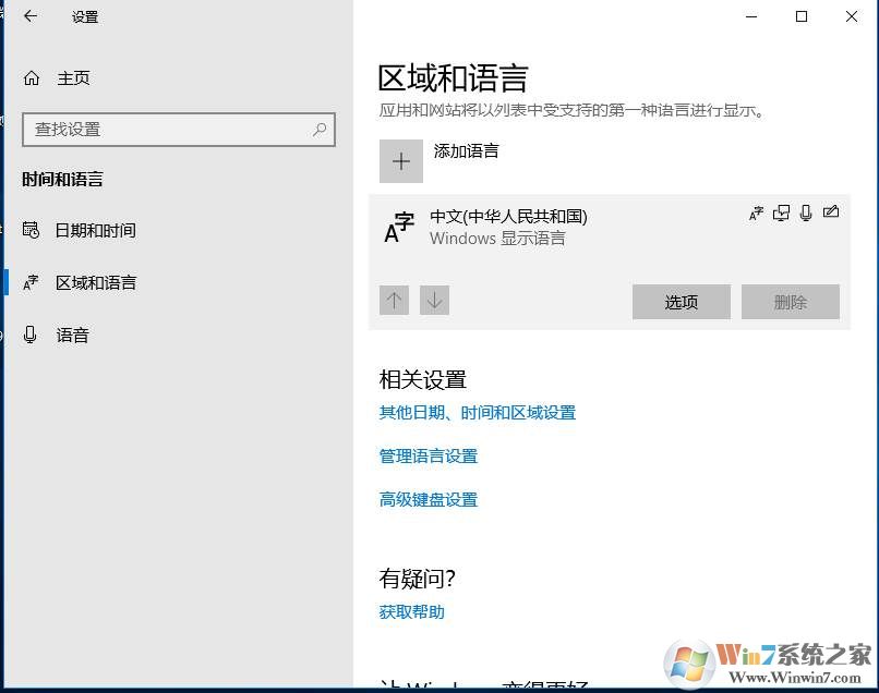 1、按下win+i组合键打开“设置”,然后依次【时间和语言】>>【区域和语言】,在右侧看下中文是否是在最上面的,(如果不是那么点击箭头把中文设置为第一个默认)如图: