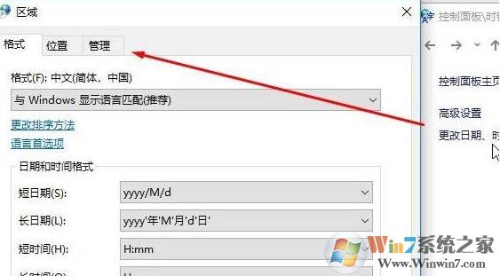 4、点击左侧的【更改日期、时间和数字格式】,在弹出的区域界面点击【管理】;