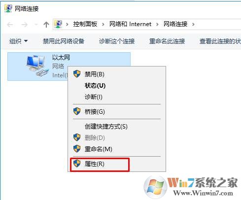 3、右键点击你要设置的以太网选择属性;(本版为1803,今后版本可能无法再打开网络连接文件夹)