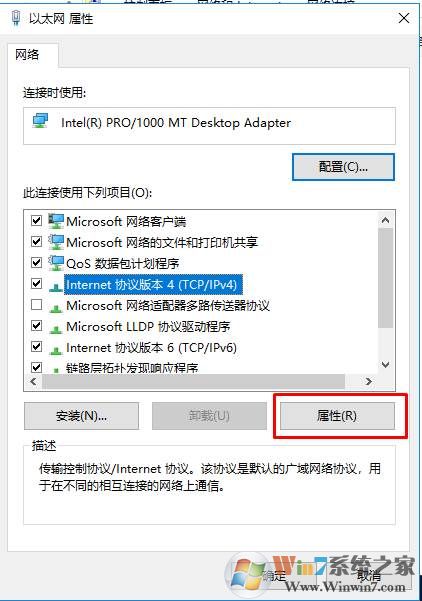 4、接下来点击internet协议版本 4 (TCP/IP),选择属性;