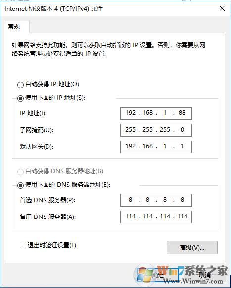5、然后选择使用下面的IP地址,默认网关填路由器IP地址,以太网IP需要和网关在同一网段,DNS可以选择常用的。如8.8.8.8(谷歌) 114.114.114.114(国内移动、电信和联通通用的DNS)