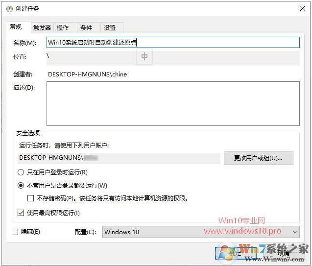 在弹出的“创建任务”窗口中的“常规”选项卡中填写任务计划的名称,例如“Win10系统启动时自动创建还原点”。如图: