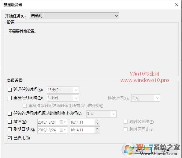 点击“触发器”选项卡左下角的“新建”按钮,在弹出的“编辑触发器”窗口中,把开始任务设置为“启动时”,确定。