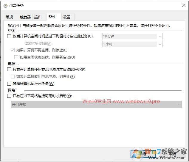 取消勾选“只有在计算机使用交流电源时才启动此任务(如果计算机改用电池电源,则停止)”和“唤醒计算机运行此任务”。