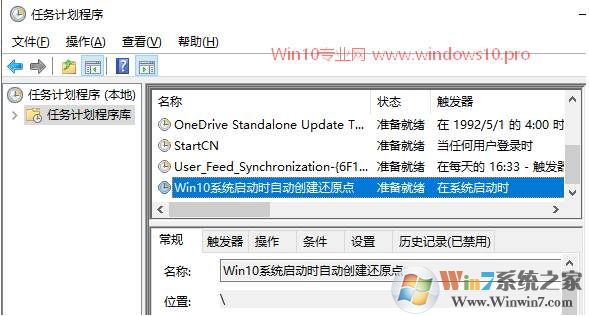 输入密码后即完成任务计划的创建,这时我们就会在“任务计划程序库”中看到刚刚创建的名为“Win10系统启动时自动创建还原点”的任务计划了。如图: