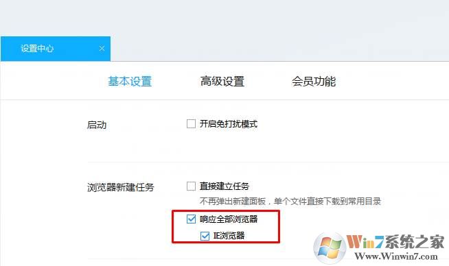 1、打开迅雷9设置中心,然后在基本设置下的“浏览器新建任务” 勾选响应全部浏览器,和IE浏览器