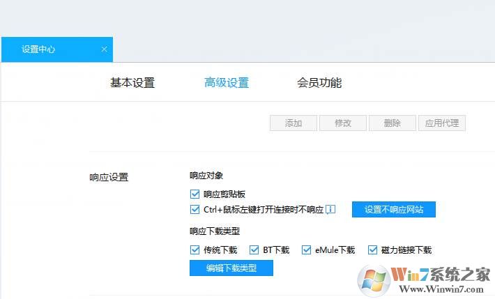2、然后在高级设置下,响应设置中 勾选以下选项,这样的话迅雷能自动识别下载链接,就可以弹出下载窗口了。