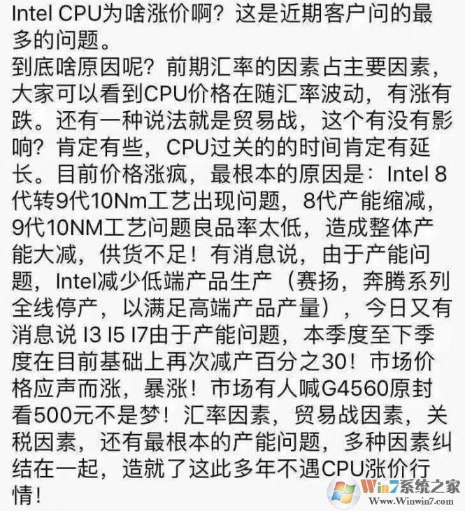 2、还有一个原因就是最近中美两国的贸易战,中国对美进口计算机硬件目前已经提升至25%的关税,必然导致CPU等硬件的价格提升,这点只能是消费者买单。