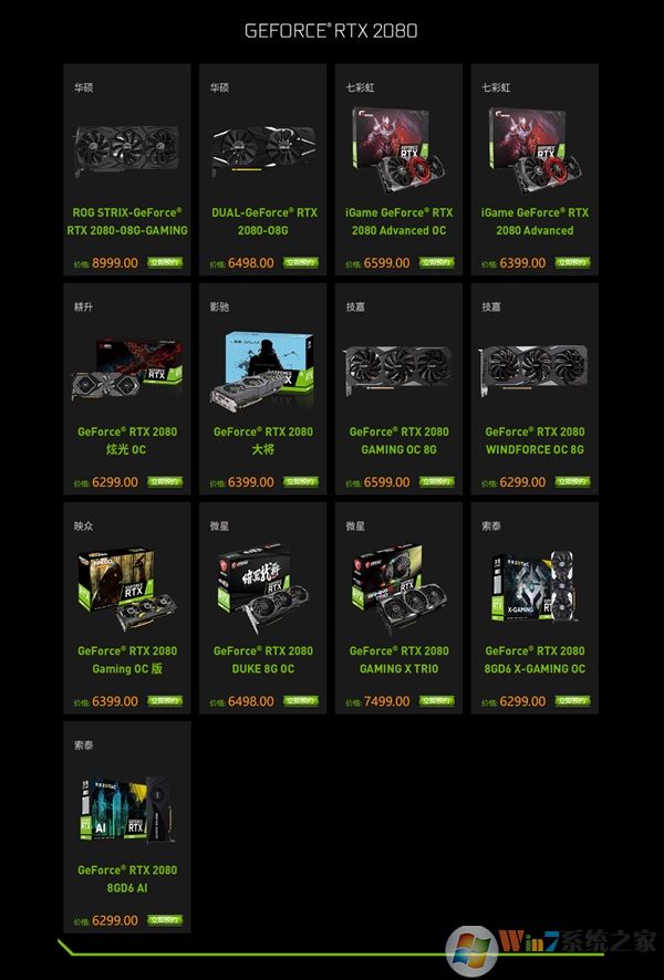 从下面可以看到,华硕、七彩虹、耕升、影驰、技嘉、映众、微星、索泰都发布了自己最新的产品,RTX2080价格在6000-6500左右,其中华硕最贵,8999.00元,这个还不如直接上2080TI吧。